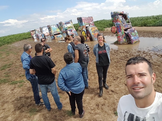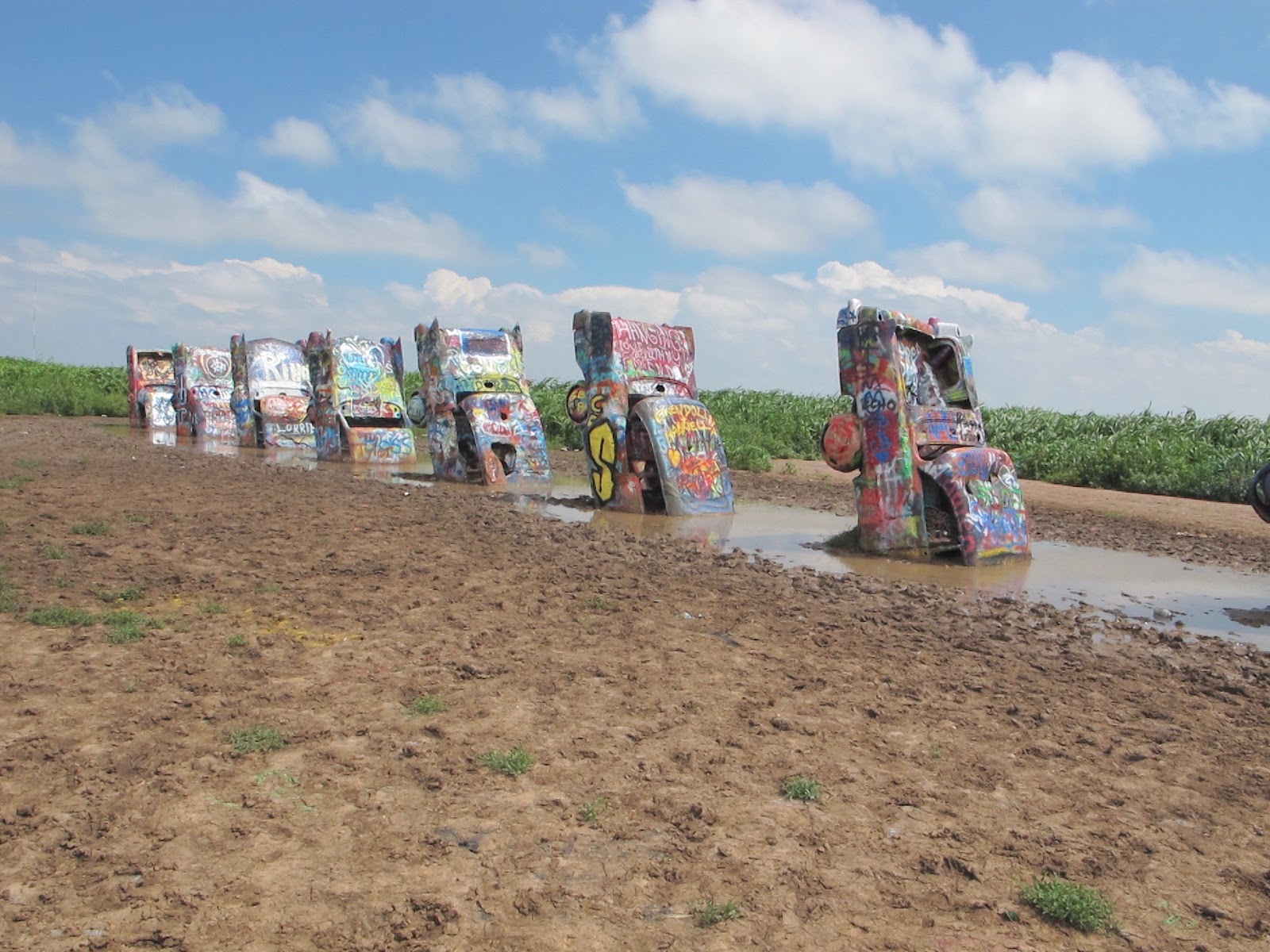 Casi en destino, tenemos el Cadillac Ranch, los maizales que lo rodean están muy verdes. Ha llovido, y hay agua y barro, es sorprendente la cantidad de gente que viene a visitarlo.