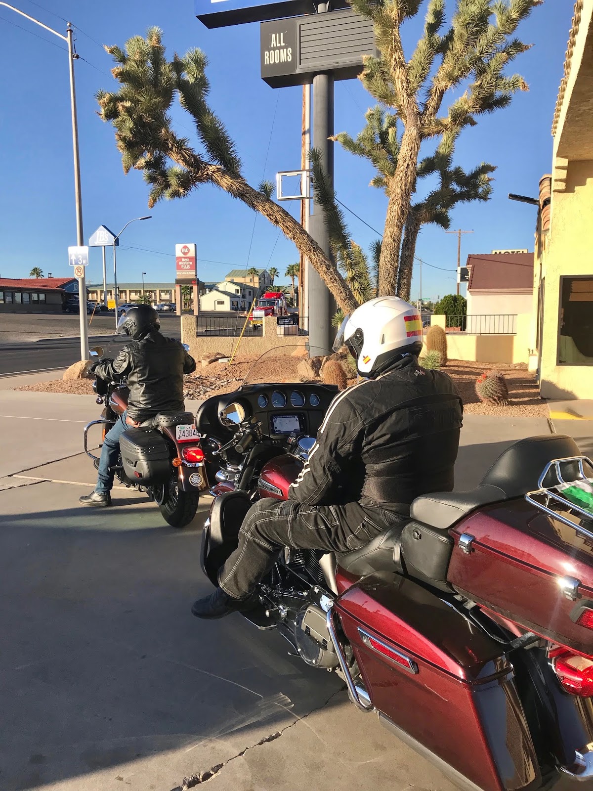 Un nuevo día del viaje en moto por USA Ha amanecido en nuestro motel, en plena ruta 66. Un Joshua Tree preside la entrada, y nos disponemos a salir a rodar, es muy temprano. Ha amanecido hace poco, y la temperatura es perfecta para rodar.